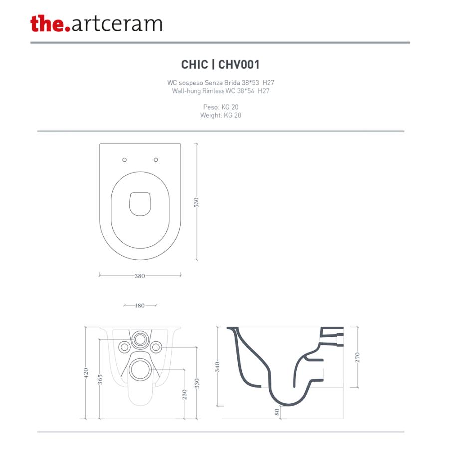 ARTCERAM Chic Унитаз подвесной Rimless 38х53 см glossy white CHV001 01 00