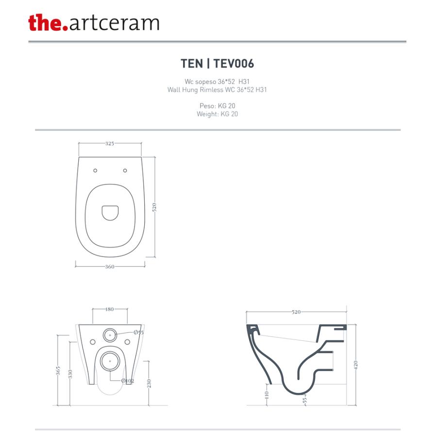 ARTCERAM Ten Унитаз подвесной Rimless 36х52 см glossy white TEV006 01 00
